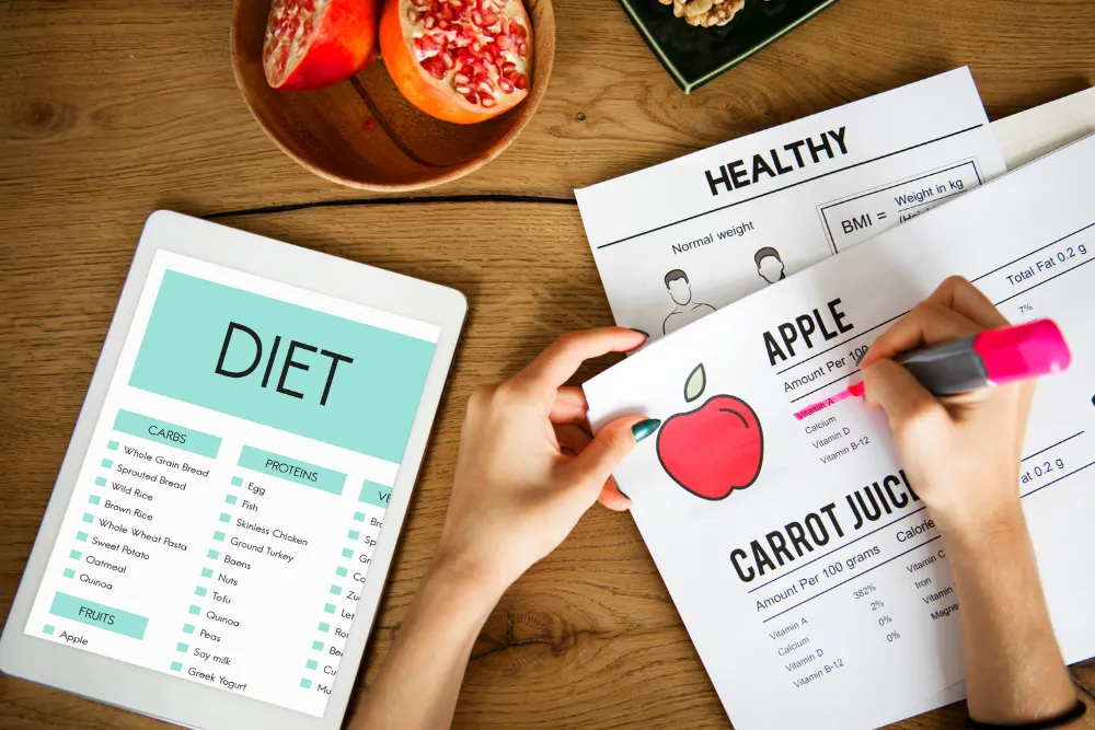 No, it only counts things like calories, not specific foods. It doesn't tell you to eat apples or stay away from pizza. You pick your meals, and the calculator just shows how they affect your weight.